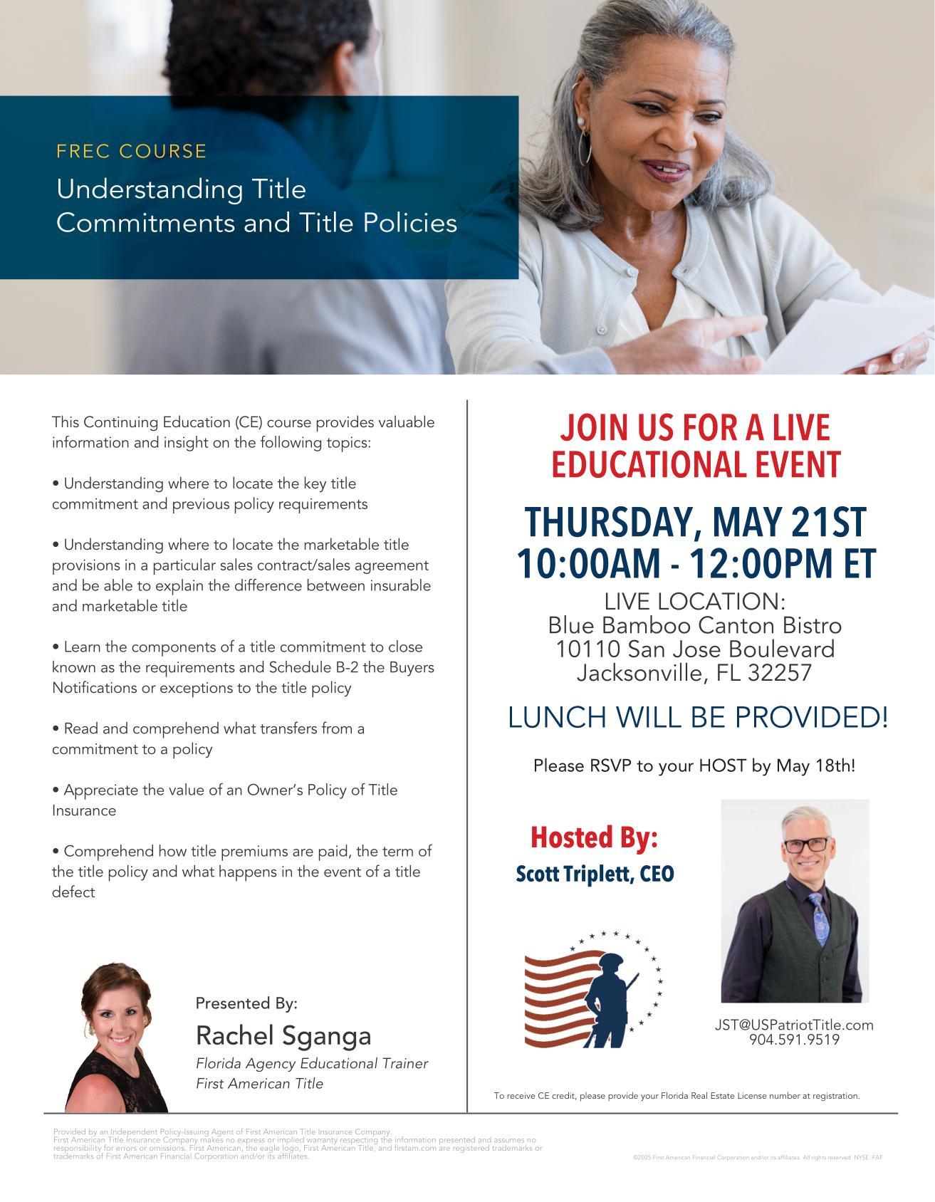 RSVP BELOW prior to May 18 – If you need to cancel your RSVP, please email jst@uspatriottitle.com so we can offer the spot to someone else. Thanks! This Continuing Education […]