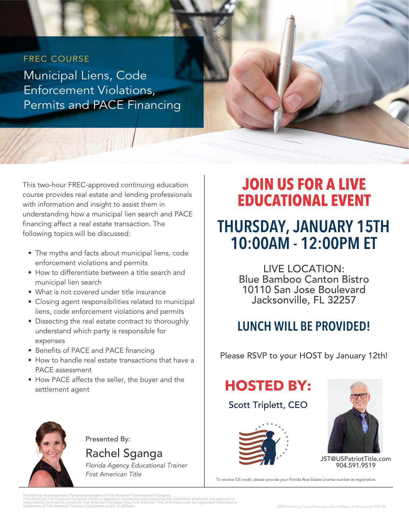 This event is free to attend in person at Blue Bamboo; however, if you RSVP and do not show up, we will ask you to cover the cost of the meal ($25). This Continuing Education (CE) course provides valuable information and insight on the following topics: • Understanding where to locate the key title commitment […]